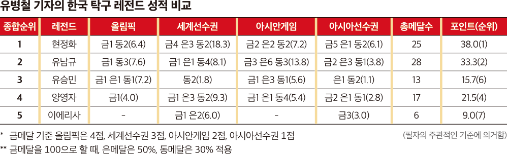 ‘국민여동생’으로 불리는 탁구스타 신유빈의 인기가 식지 않고 있다. 탁구는 1958년 아시안게임 정식 종목으로 채택이 되었고, 뒤이어 1988년 올림픽 정식 종목이 되며 주요 국제대회에서 빼어난 성적으로 한국스포츠를 빛낸 효자종목이다. 신유빈에 앞서 한국 탁구를 빛낸 레전드 5명을 되돌아봤다. 포인트 순위에 인지도, 탁구계 의견, 필자의 주관적인 판단을 더해 순위를 매겼다.