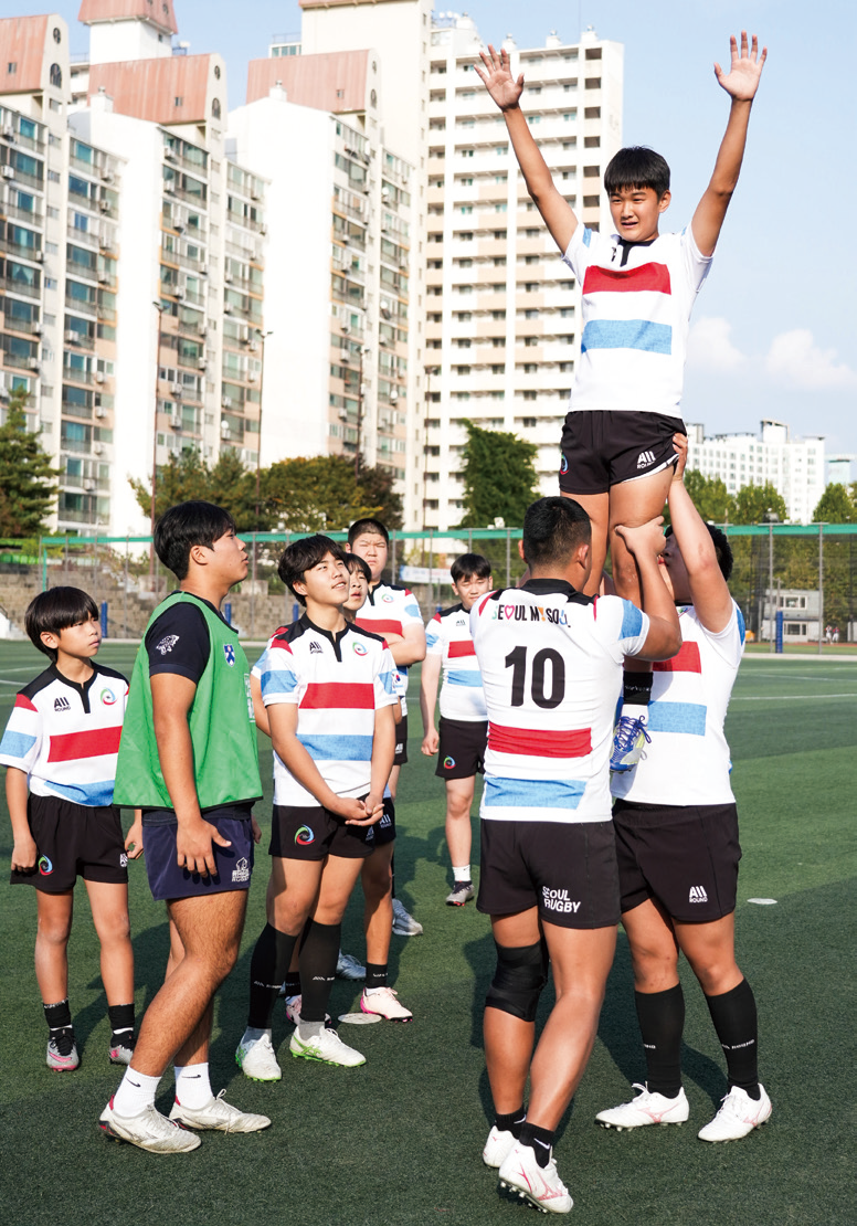 이어진 라인아웃(경기장 바깥으로 나간 공을 받기 위해 한 명의 선수를 다른 선수들이 높게 들어 올리는 방법) 훈련에서도 마찬가지. 서울시 럭비 클럽이 뒤를 이어 라인아웃을 해보았지만 들어 올려지는 선수의 몸이 높게 띄워지지 않았다. “다리를 붙이고 고정을 해야 해. 시작할 때는 네가 뛰어 줘야 들어 올릴 수 있어.” 배재고 럭비부 선수들이 너나 할 것 없이 적극적으로 가르침을 전했다. 그리고 세 번째 시도에서 함성이 터져 나왔다. “그렇지!” 배재고 럭비부 선수들은 자신이 성공한 마냥 크게 기뻐하며 박수를 쳤다.