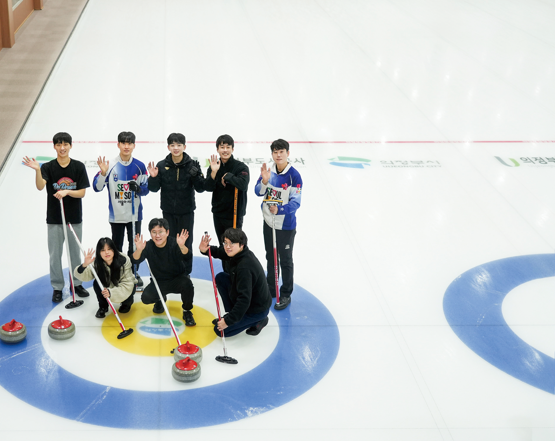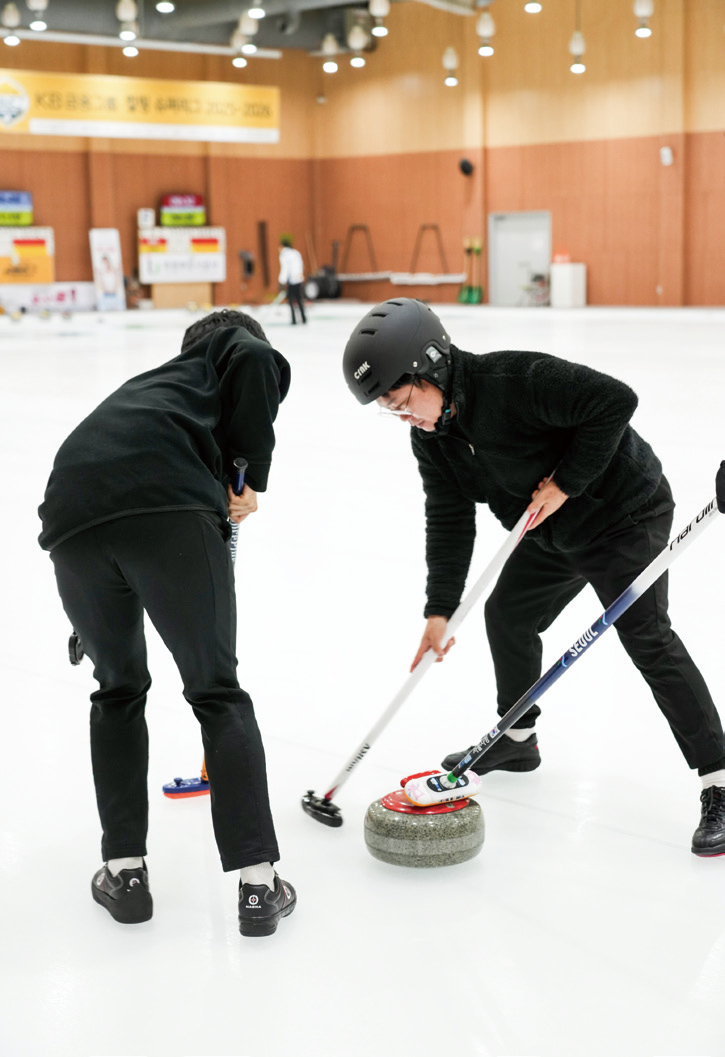 - 이젠 스위핑을 배울 차례. 스위핑은 스톤의 방향과 속도 조절을 위해 빙판을 매끄럽게 만들어주는 작업이다. “생각보다 훨씬 힘들어요. 숨이 차네요!” 방용수 회원의 말에 이 선수는 “실제 경기에서는 스톤이 더 빨리 움직여요. 체중을 실어야 하기 때문에 생각보다 더 체력이나 스킬이 필요하답니다.”라고 답했다. 이어서 이 선수가 직접 시범을 보이자 회원들의 입에서 감탄이 터져 나왔다. 회원들은 질문을 하며 적극적으로 수업을 들었고, 이 선수 역시 이에 호응해 실제 경기를 할 때처럼 스톤을 투구하기도 하고 자세를 교정해주기도 했다. 기본적인 동작들을 다 배웠으니 미니 게임을 통해 실전에 적용해볼 시간. “스톤을 놓을 때 손을 약간 틀어서 방향을 조절해요. 운전을 할 때와 같아요. 오른쪽으로 보내고 싶다면 시계 방향으로 살짝 트는 거죠.” 전략을 짜는 스킵(Skip)을 맡은 선수가 스톤의 방향을 지시하면 해당 차례의 투구를 맡은 선수가 스톤을 던지고, 나머지 선수들은 브룸으로 스위핑을 한다. 한 번의 투구에 모든 선수들이 참여하기 때문에 회원들은 절로 팀원들끼리 모여 상의를 하고 스톤의 전진을 진지하게 바라봤다. 컬링의 묘미인 팀워크가 발휘된 것. 스톤이 원하는 방향으로 갔을 때는 하이파이브를 하며 함께 기뻐하고, 하우스(House, 스톤을 넣어야 하는 네 개의 원)를 벗어났을 때는 동시에 탄식을 터트렸다. 미니 게임이 끝나고 나서도 회원들은 옹기종기 모여 마치 정말 한 팀인 양 컬링에 대한 이야기를 이어 나갔다. “처음 컬링을 배울 때를 제외하고 강습을 받은 적이 없는데, 디테일하게 피드백해주셔서 새로 알게 되는 것들이 많아요.” 컬링 3년 차라는 최재현 회원 역시 이번 수업은 남달랐다며 감상을 전했다. “빙상장에서 하는 건 느낌이 많이 다르고 힘도 들지만 그만큼 재미가 커요. 오늘을 계기로 컬링을 더 열심히 하게 될 것 같아요!” 방용수 회원은 수업의 여운이 가시지 않은 상기된 표정으로 소감을 말했다. 함께 만들어 가는 건강한 서울이 이들의 손끝에서 탄생할 것이라 믿게 만드는 얼굴이었다.