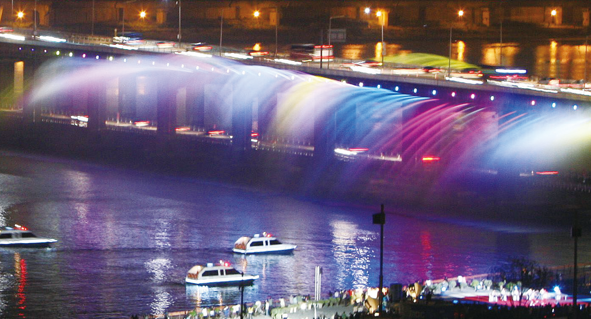 위층에 있는 반포대교도 달빛무지개분수가 설치되면서 새롭게 변신하게 된다. 반포대교 상판에 조명과 함께 분수 시설이 설치돼 더위에 지친 시민들의 가슴을 적셔주게 된 것이다. 형형색색의 조명과