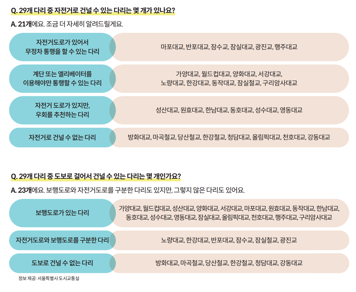 필자가 도보여행가라서 그럴까? 한강에 있는 다리들을 걸어서 넘기 편한 순으로 분류한 적이 있다. ‘편함’의 조건은 다음과 같다.